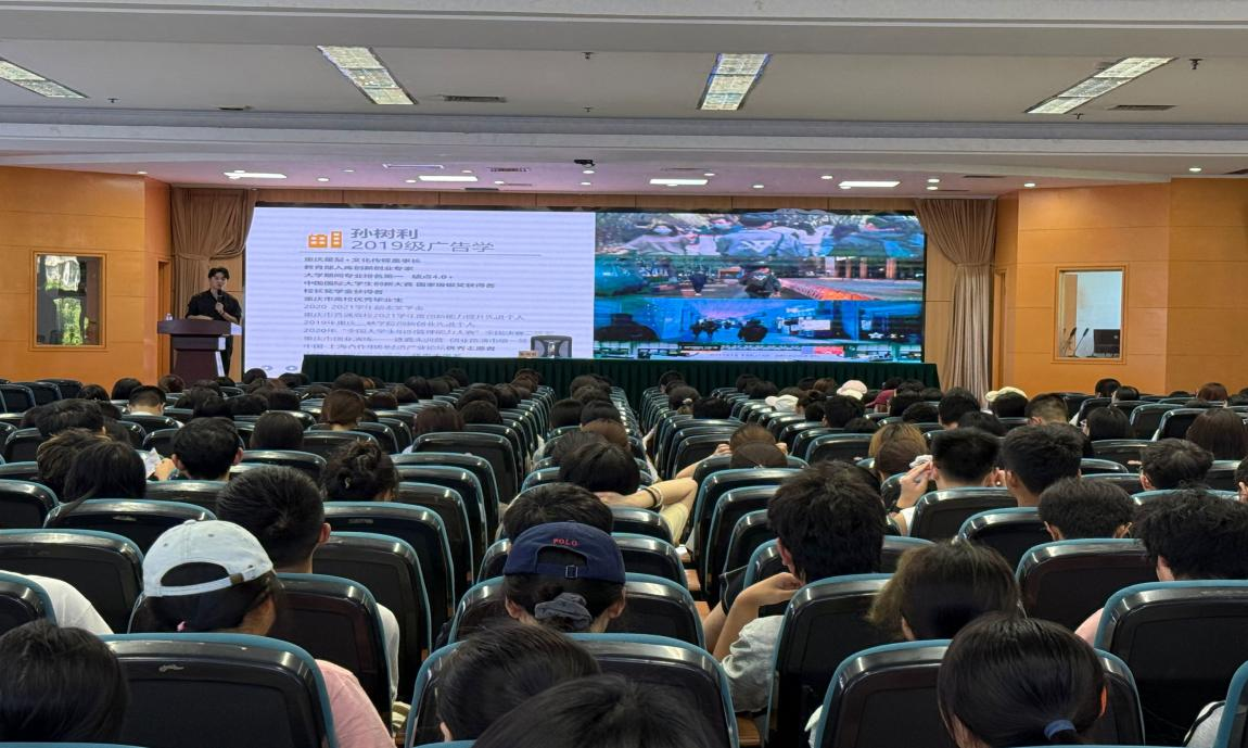 孙树利系我院2019级广告学专业毕业生,现为青年创业者。活动中,他以亲切幽默的语言,结合自身大学成长与创业经历,分享了学习、竞赛与创业的宝贵经验。他坦言自己也曾经历迷茫期,但强调“目标”是推动成长的关键动力。他鼓励新生主动参与高等级赛事、跨专业团队项目及志愿服务,在实践中锻炼能力。提及曾以0.1分之差与中国国际大学生创新大赛金奖失之交臂的经历,他笑称“取上者得其中”,激励同学们不畏失败、勇于尝试。在互动环节,同学们围绕“如何发掘创业机会”“专业学习与个人爱好如何平衡”等问题踊跃提问,孙树利结合具体案例一一给予耐心解答,现场气氛热烈,掌声不断。