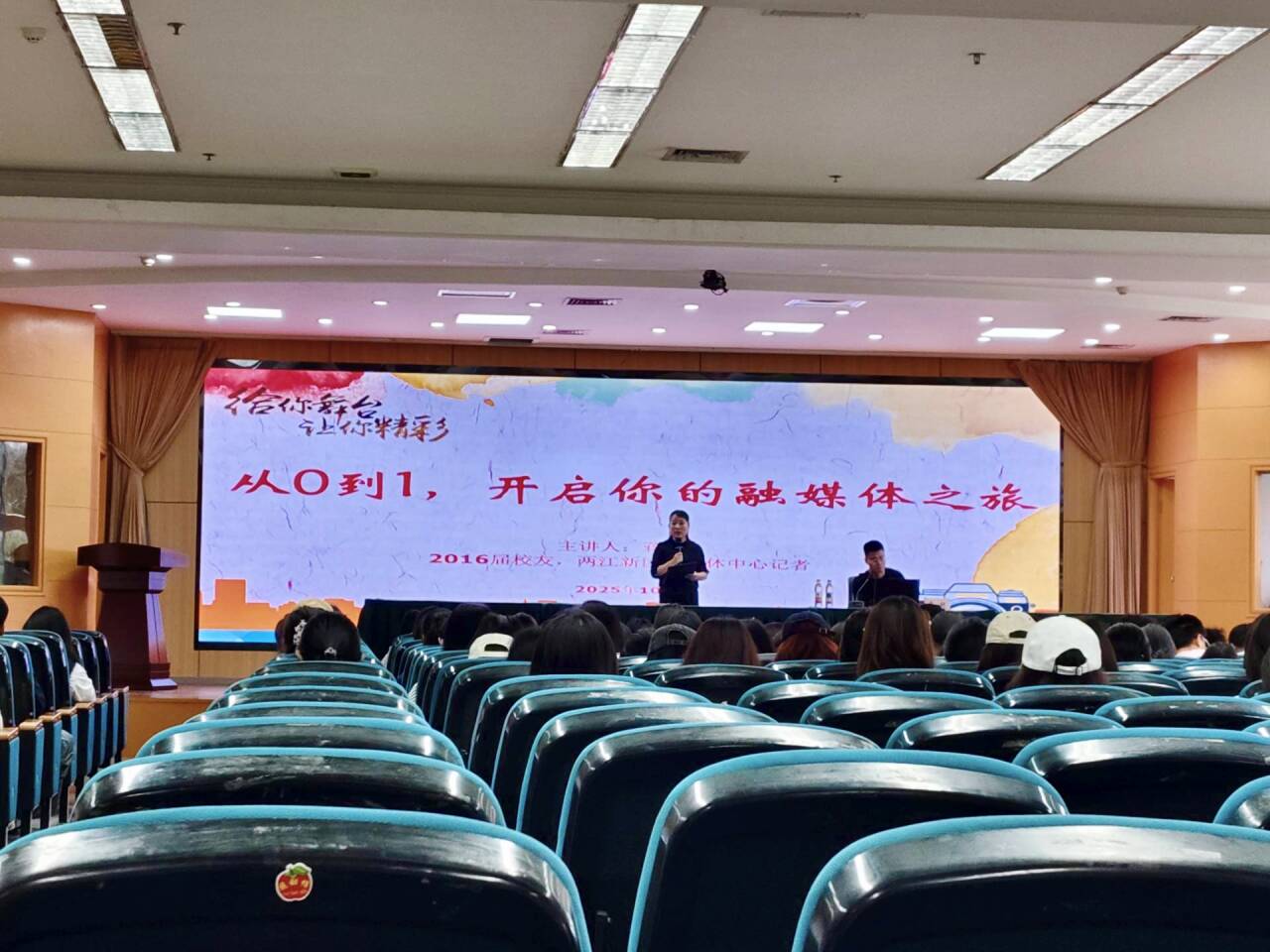 为深化学生对融媒体行业的认知,明晰职业发展方向,激发专业学习热情,10月18日上午,传媒学院在沙龙校区学术报告厅成功举办“从0到1 开启你的融媒体之旅”专题讲座。本次活动由学院党总支副书记、副院长张春蕾主持,特邀优秀校友、融媒体领域青年从业者蒋锐担任主讲嘉宾。