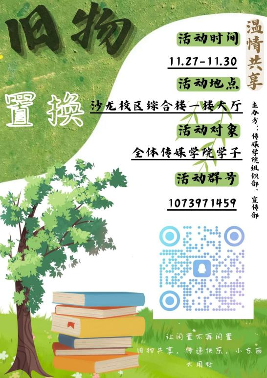 为倡导绿色环保理念、促进闲置物品循环利用,近日,传媒学院开展了“旧物置换・共享温情”主题公益活动,吸引了全院师生的积极参与。